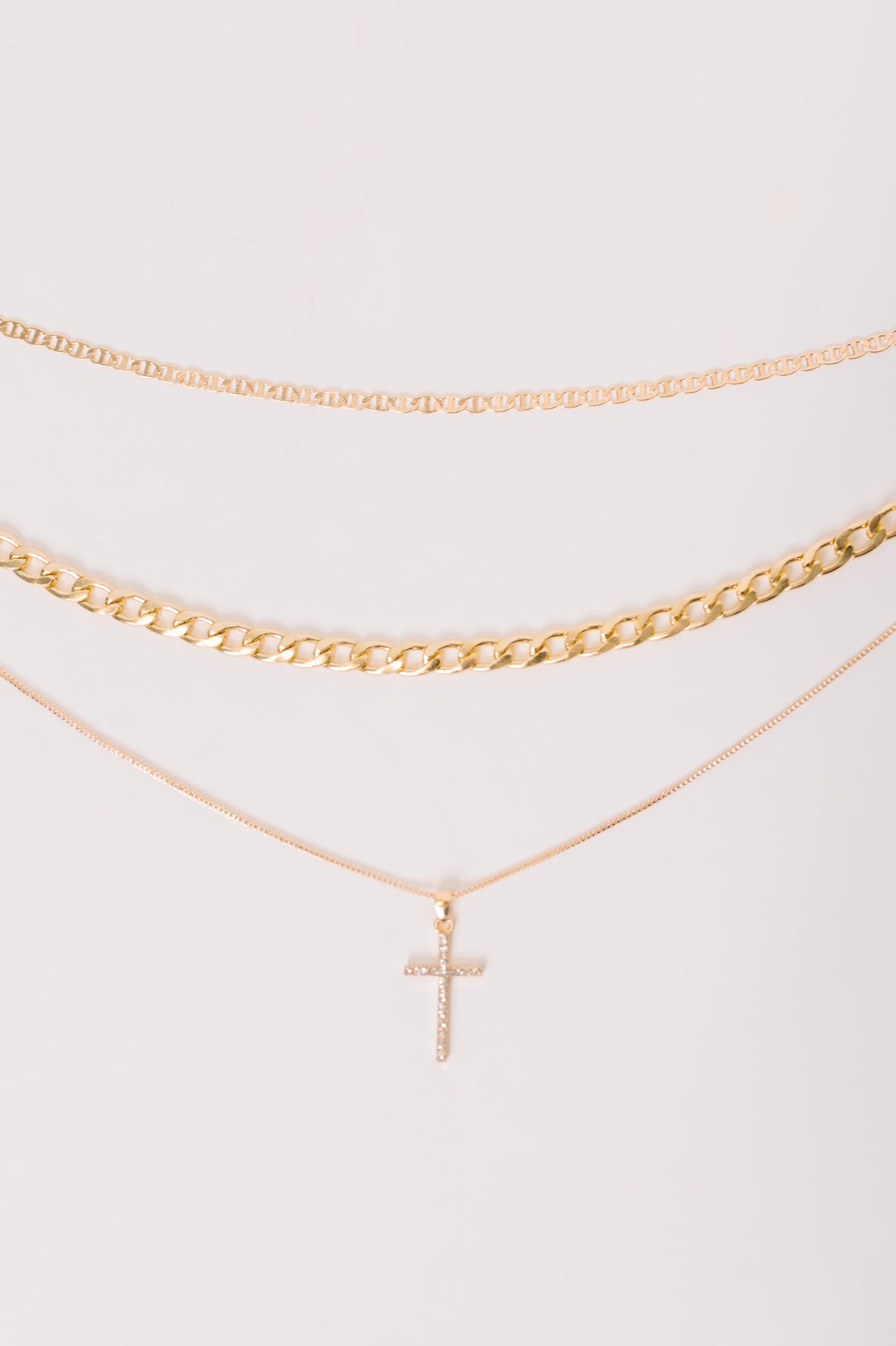 Stack your faith with style in this Layered Faith Necklace, a gold-plated stunner that celebrates your beliefs in the most chic way possible. Three distinct chains work together in perfect harmony—a flat mariner chain, a trendy paperclip chain, and a delicate dainty chain—each with adjustable extenders for the perfect fit. The sparkling pavé cross pendant adds spiritual sparkle and serves as the focal point of this multi-layered masterpiece. Secured with a reliable lobster clasp, this necklace is ready to become your go-to accessory for everyday inspiration.