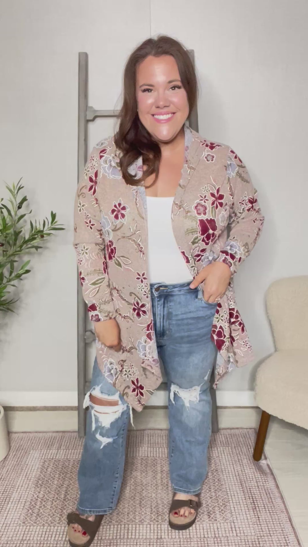 Wrap yourself in effortless charm with the Botanical Breeze Cardigan — a floral statement layer that's as soft as it is eye-catching. Featuring a cascading open front, lightweight feel, and stunning embroidered-style print in earthy neutrals and pops of burgundy and blue, it’s perfect for throwing on over basics or dressing up your denim.
