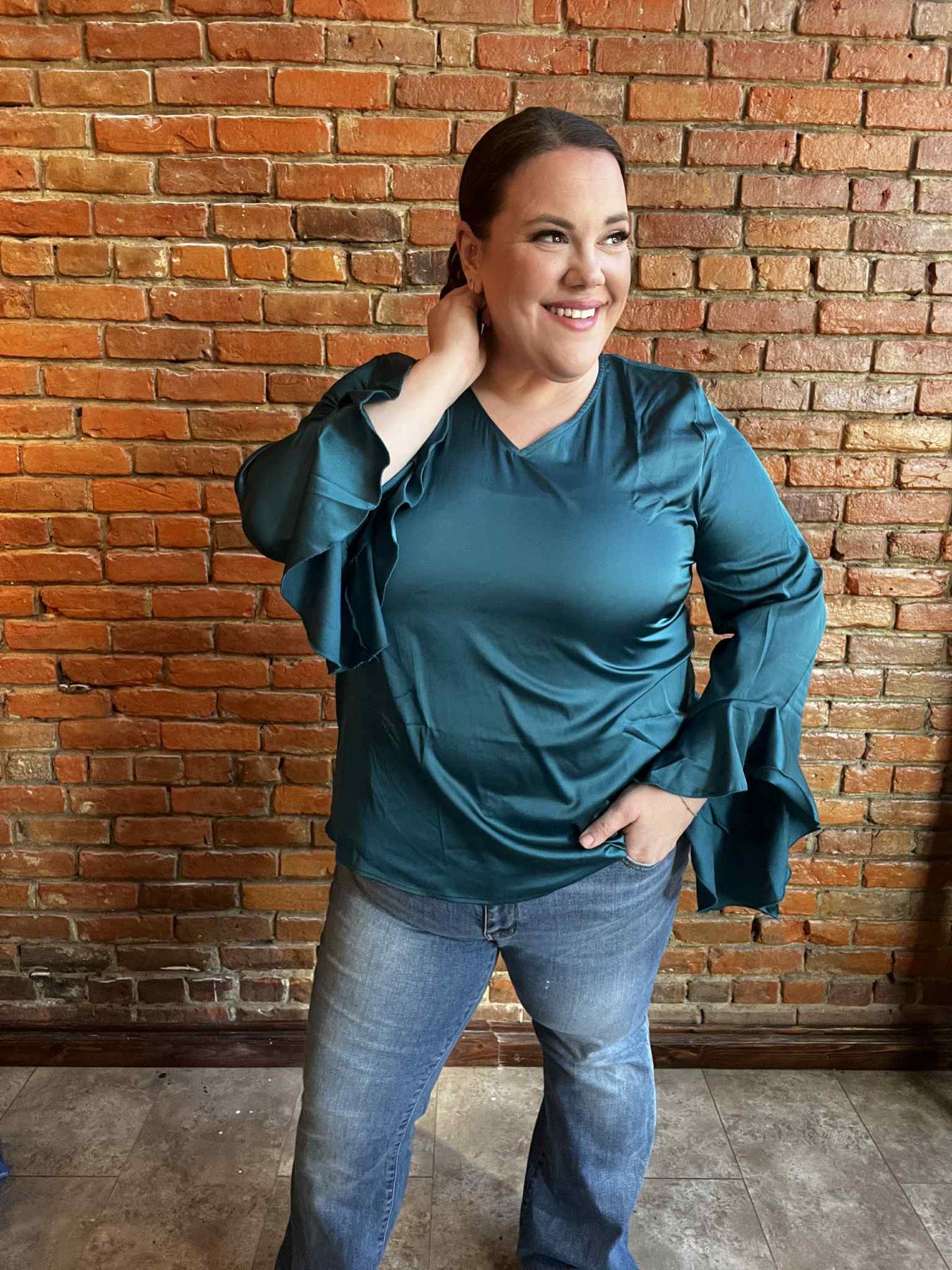 This eye-catching teal beauty is crafted from smooth, high-shine satin that feels as luxurious as it looks. Featuring a flattering v-neckline and statement making tiered ruffle sleeves, it’s the perfect mix of elegance and playful charm.