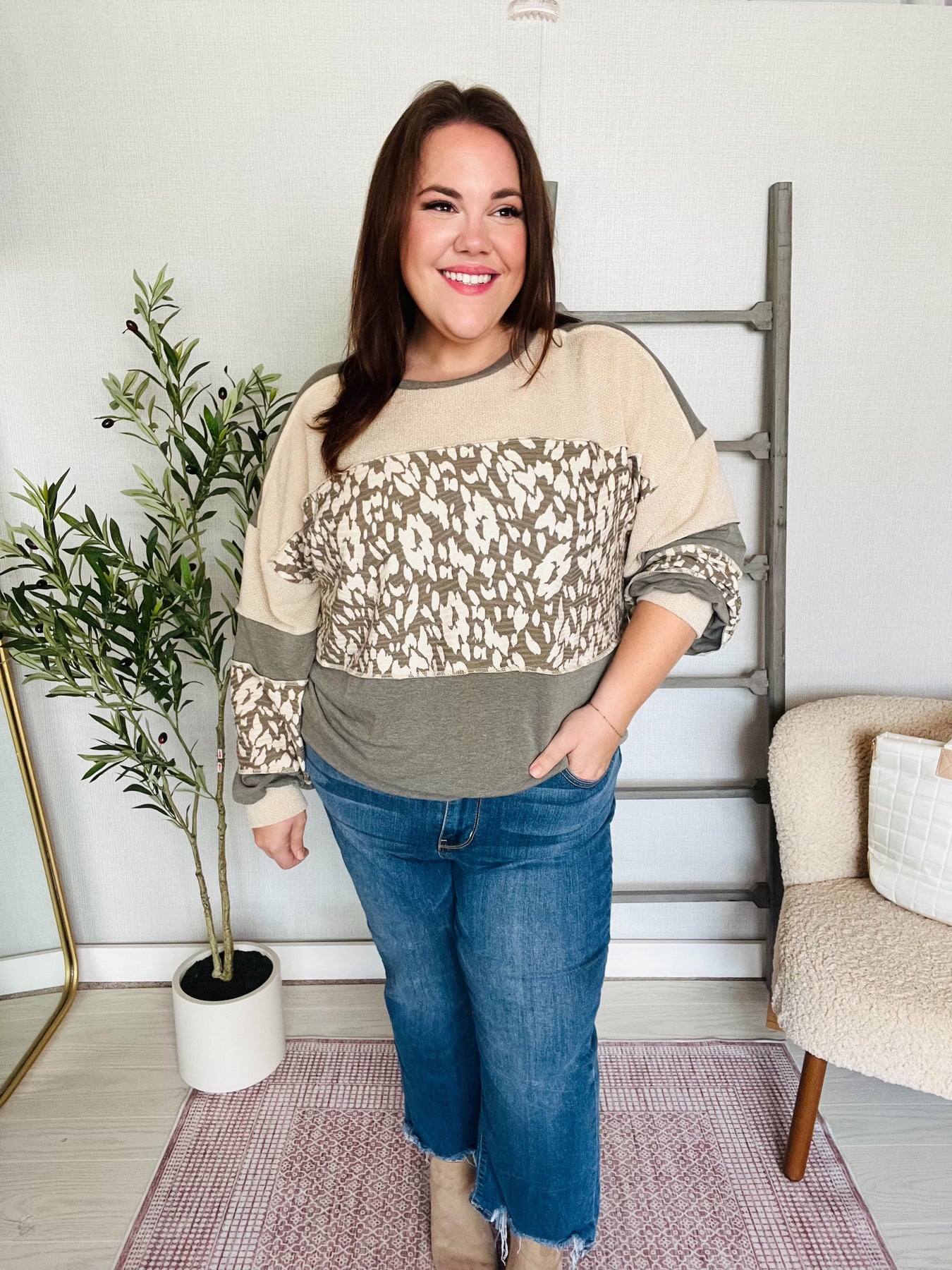 This pullover is such a good mix of comfy and stylish. It’s got that colorblock look with soft beige on top, a fun animal print across the chest and sleeves, then a washed grey at the bottom. The fabric feels lightweight but still cozy, kind of that in-between weight you can wear year round. The fit is relaxed and a little slouchy. Pairs perfectly with denim or leggings.