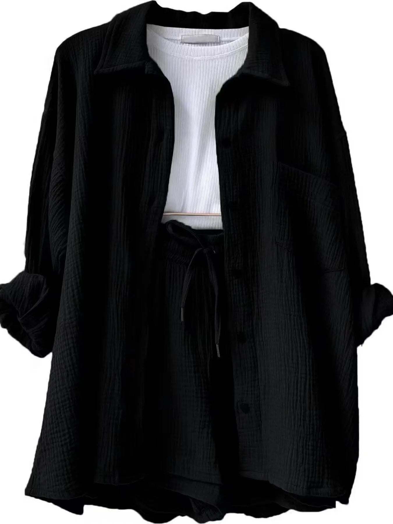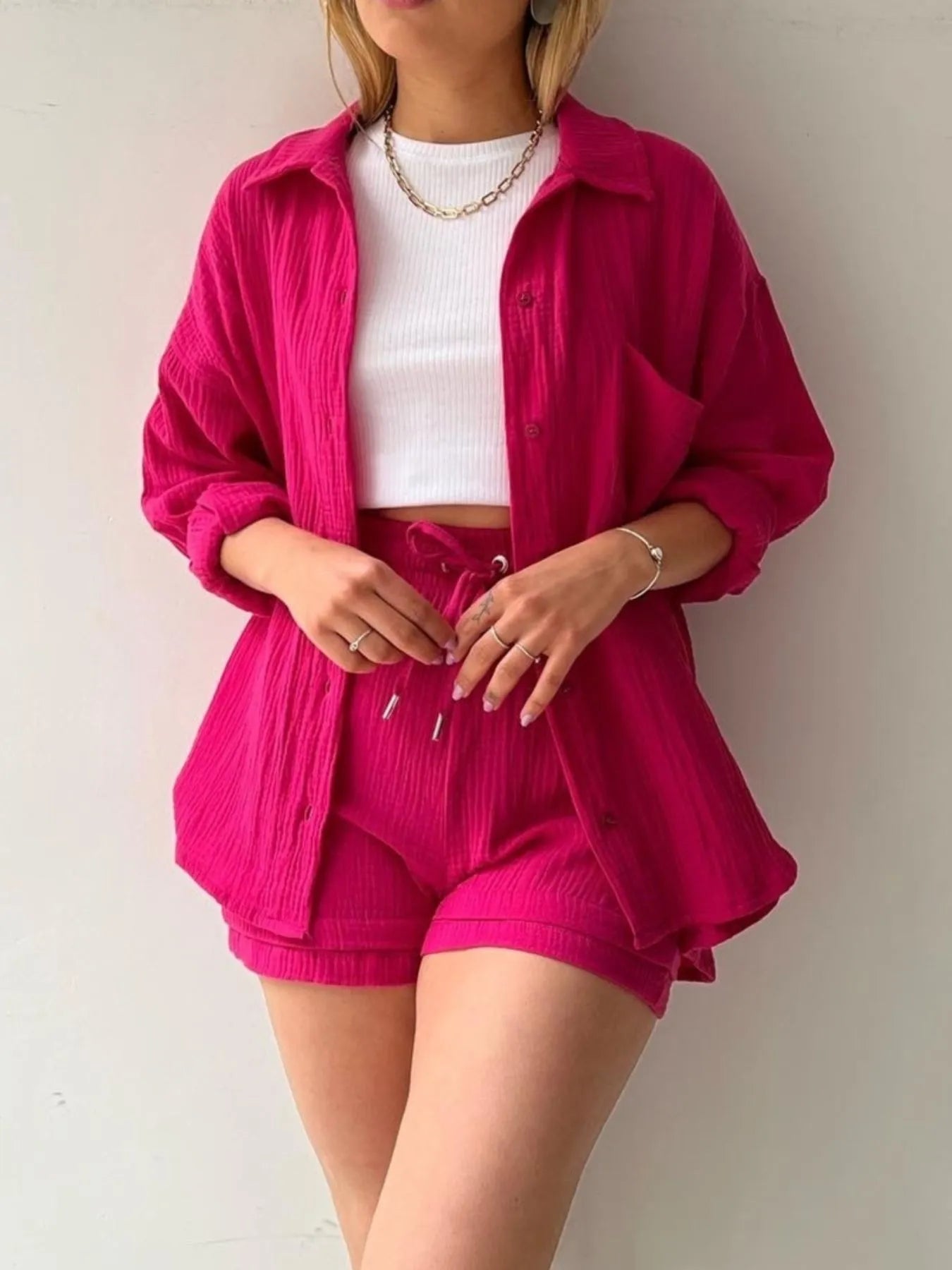 This oversized two-piece set features a button-up top and drawstring shorts in soft, textured crinkle fabric (100% polyester but trust us, it feels like a dream). No stretch, just flowy comfort and cool-girl energy. Wear it together or mix and match with your fave basics. Comes in a full rainbow of 12 colors, sizes S–2X. Machine washable, tumble dry low, zero stress.