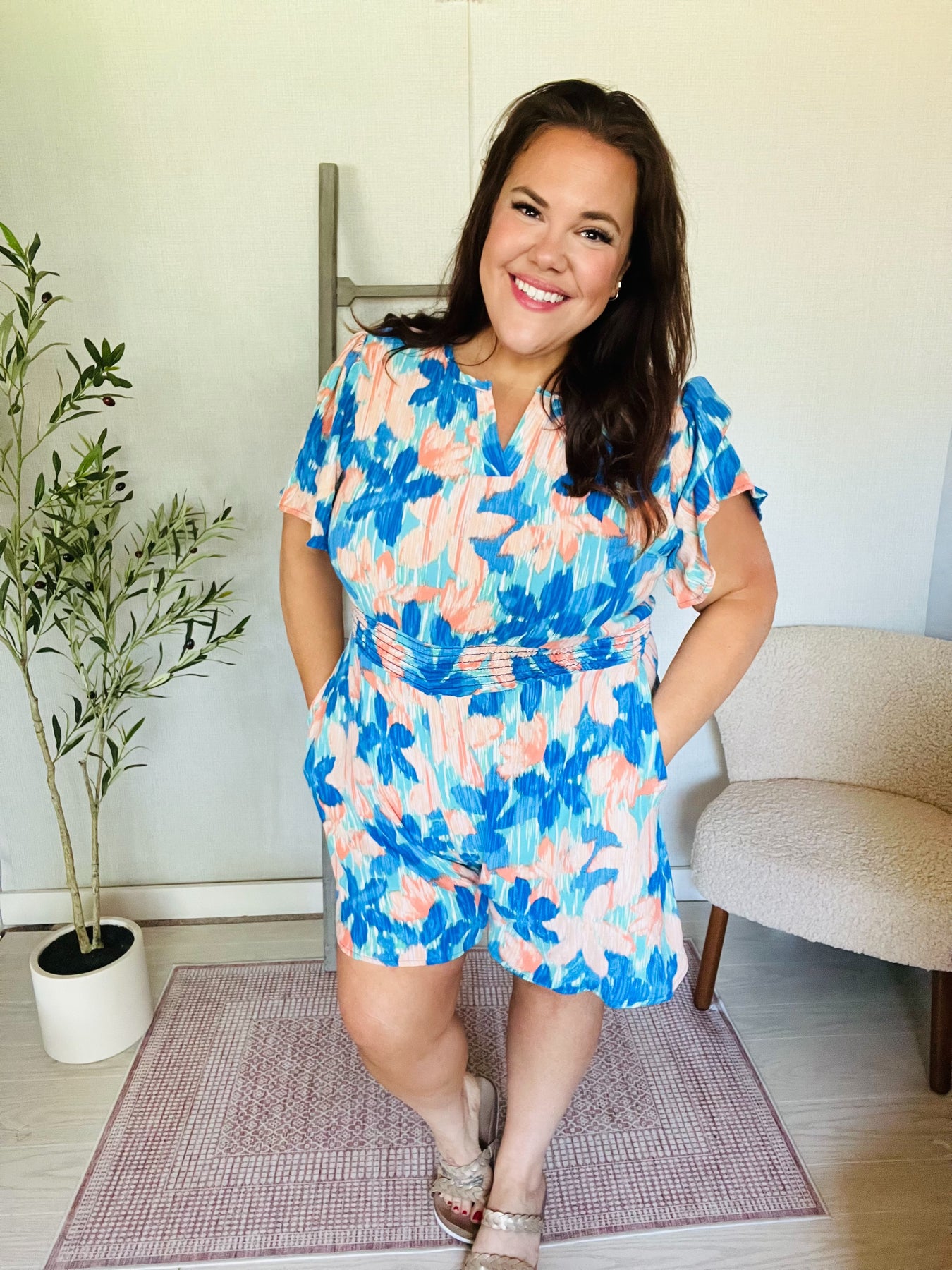 Designed with side pockets, a smocked waist, flutter ruffle sleeves and a back neck button closure. Look stunning in this flattering romper!