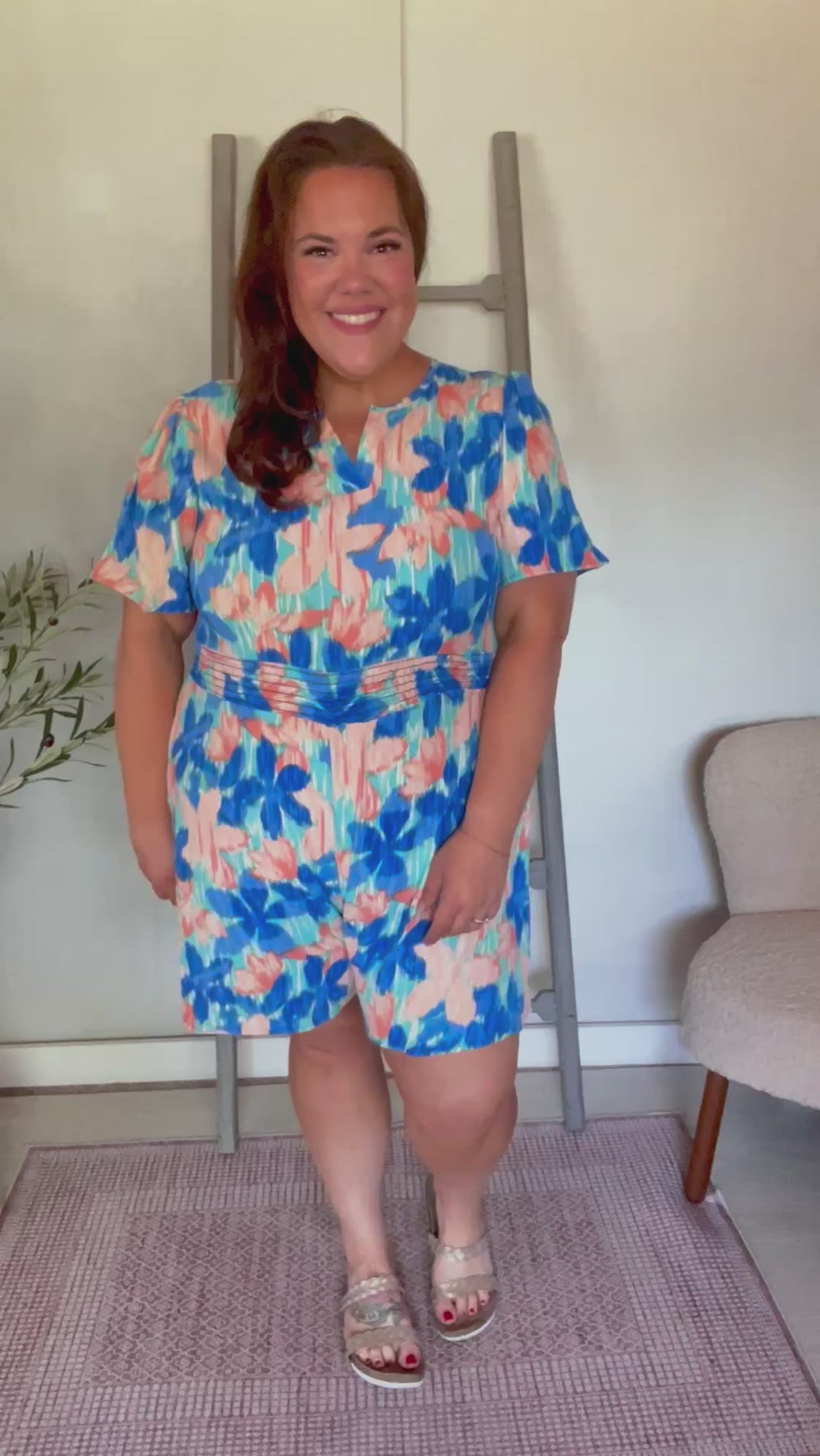 Sunset-inspired hues meet a flattering pleated waistline in this breezy romper. A vacation-ready look you can wear anywhere.