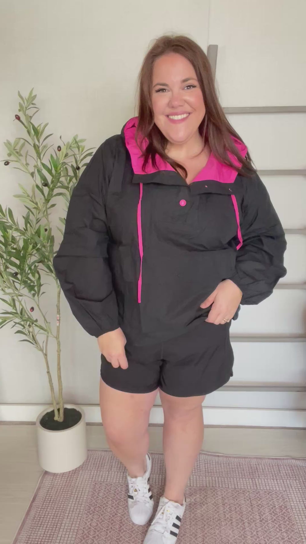 This black cotton pullover is so fun with the hot pink details popping through. The buttons and drawstrings give it just enough color to stand out. It’s lightweight but still cozy, perfect for layering on cooler days or just tossing on with jeans and sneakers. The fit is relaxed, slightly oversized with roomy sleeves and a big front pocket.