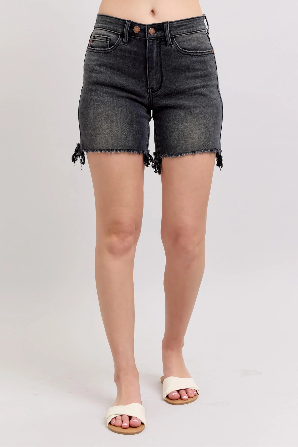 These fashion high-waisted denim shorts feature a classic washed black finish and contemporary distressed details. Made from quality stretch denim that provides comfort and flexibility. The raw, frayed hem adds an edgy touch while the mid-thigh length offers flattering coverage. Traditional 5-pocket design and button-fly closure ensure practical functionality. Perfect for casual summer styling, these shorts can be paired with any top for a versatile warm-weather look.