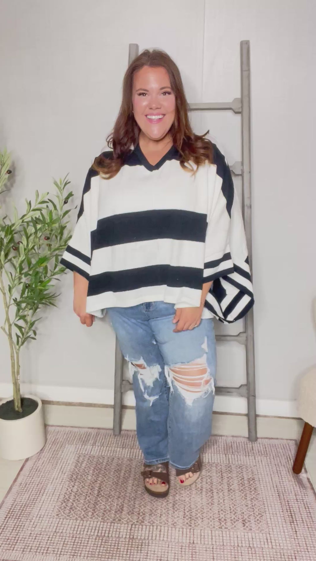 🖤 Soft + stretchy fabric 🖌️ Bold black + ivory stripe 👚 Oversized fit with v-neck 🛋️ Lounge-level comfort with dressed-up energy